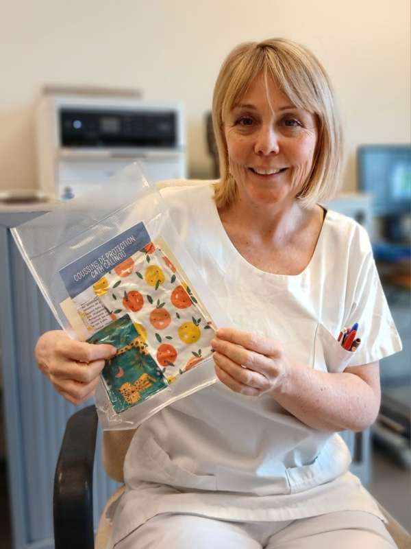 C’est avec cet objectif que l’association Cath Câlinou confectionne et offre gratuitement aux personnes atteintes de cancer des coussins de protection Cath Câlinou, spécialement conçus pour protéger la Chambre à Cathéter Implantable, durant et après la chimiothérapie des appuis et frottements douloureux causés par la ceinture de sécurité, les sous-vêtements ou encore le sac à bandoulière. A ces coussins, elle ajoute des dessins, des mots, des poupées, des photos,... pour apporter un soutien moral complémentaire.