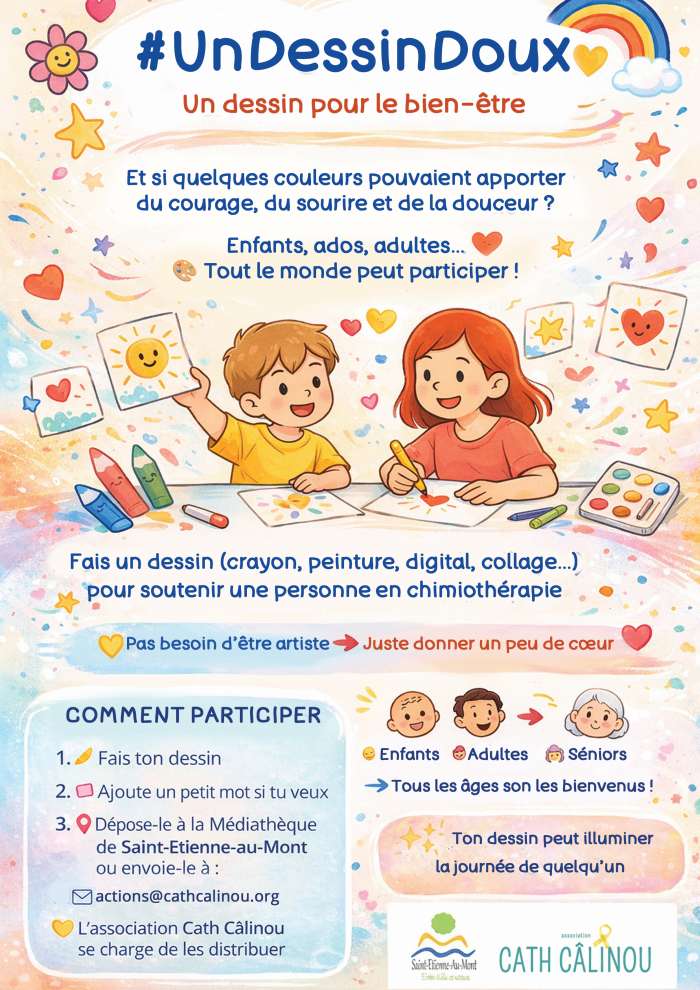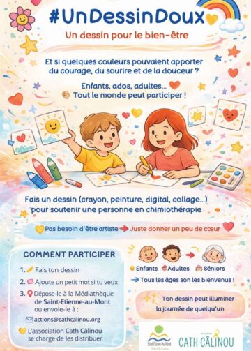 Cath Câlinou invite petits et grands à faire un #UnDessinDoux pour l'ajouter dans nos pochettes de coussins de protection afi d'apporter un soutien moral complémentaire aux personnes en chimiothérapie.